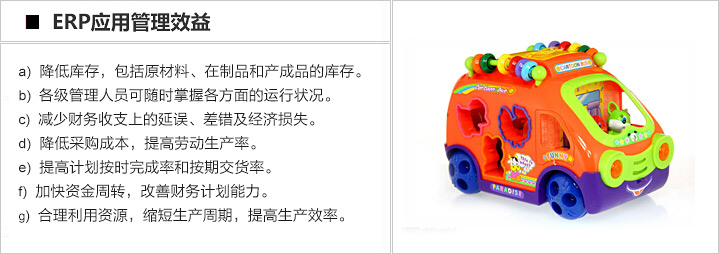 玩具行业已成为我国出口五大支柱商品之一,中国玩具市场上约有产品3万多种,按大类分主要有电子类、机械模型类、塑胶玩具、木制玩具等。内地玩具市场规模庞大发展迅速,上升空间巨大,随着城市居民收入提高、生活质量的改善,内地居民对玩具的需求已开始从传统的、中低档次的电动型、拼装型、装饰型玩具转向新颖的电子型、智慧型玩具及高档的毛绒、布制类装饰型玩具。为了应对更加激烈的竞争,企业的信息化管理必不可少。