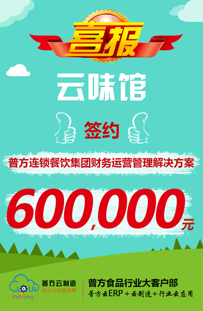 热烈祝贺 普方食品行业大客户事业部成功签约著名食品品牌云味馆,项目金额【60万】!
