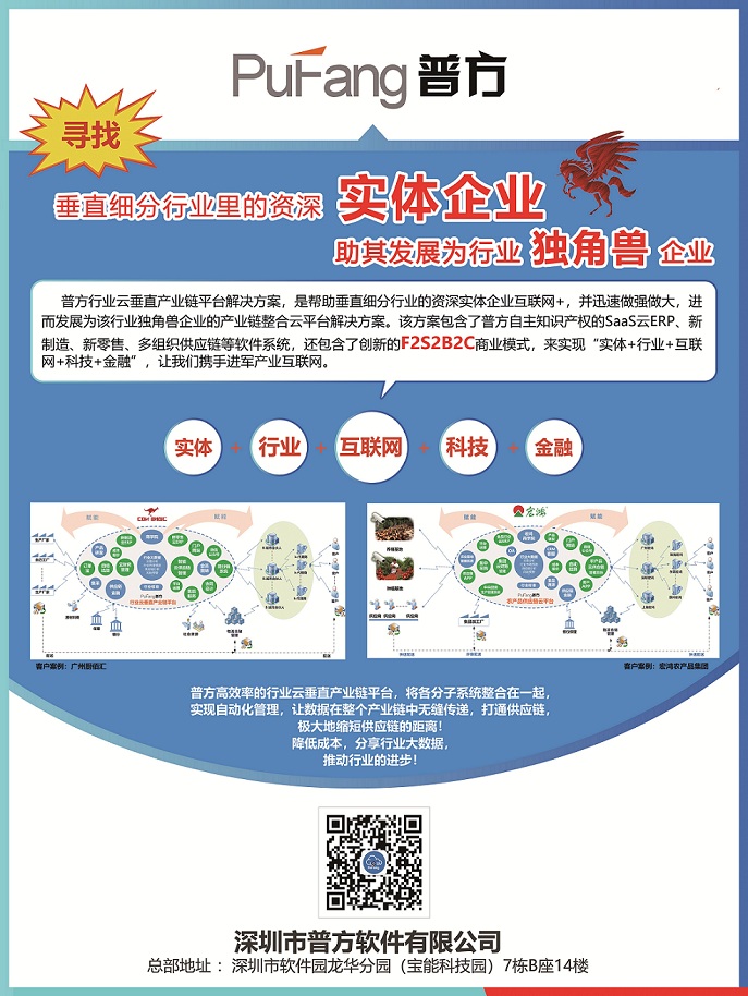 该方案包含了普方自主知识产权的SaaS云ERP、新制造、新零售、多组织供应链等软件系统,还包含了创新的“F2S2B2b2C”商业模式,来实现“实体+行业+互联网+科技+金融”,让我们携手进军产业互联网。